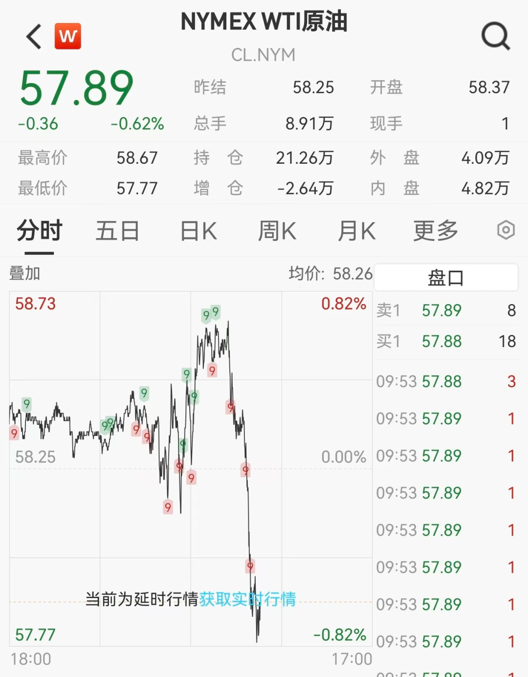 国际油价直线跳水,截至22:40左右,WTI原油、ICE布油均跌约0.6%,今年以来累计下跌超17%。